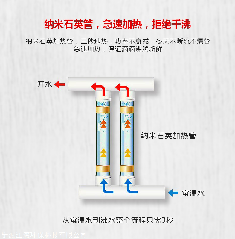 2,使用纳米电热管水力分开技术加热元件,专利二次沸腾技术,以防“千开水”